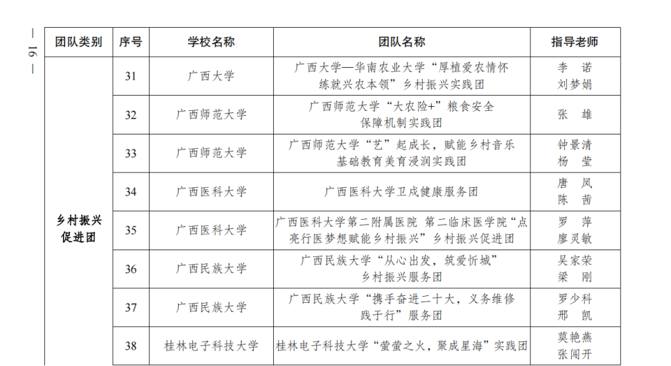 根据《关于开展 2023 年广西大中专员工志愿者暑期文化科技卫生“三下乡”社会实践活动的通知》(桂青联发〔2023〕17 号)要求,经公司申报、材料审核、评议研究,最终评出 2023 年广西大中专员工志愿者暑期文化科技卫生“三下乡”社会实践活动全国重点团队 68 支、自治区重点团队 200支。