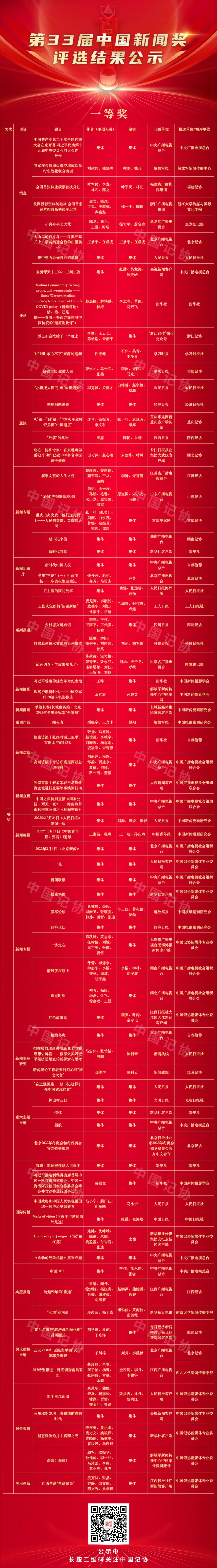 由中华全国新闻工作者协会(简称“中国记协”)主办的第33届中国新闻奖评选结果自今日起在中国记协微信公众号、中国记协网公示。本届拟获奖作品378件,其中特别奖3件、一等奖74件、二等奖114件、三等奖187件。