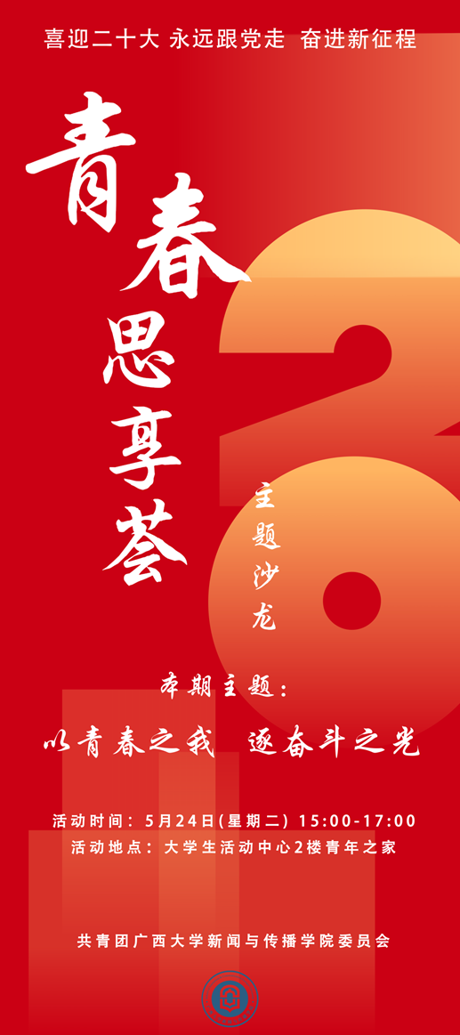 为展现新时代中国青年有理想、有本领、有担当的青春面貌和不懈奋斗的昂扬姿态,喜迎党的二十大胜利到来,william威廉亚洲将于5月24日(周二)15:00在老员工活动中心二楼青年之家举行“以青春之我,逐奋斗之光”青春思享荟主题沙龙(第二期)。从青年的视角,讲述青春故事,传递精神力量,从而更好鼓舞青年朋友在新时代勇毅前行。