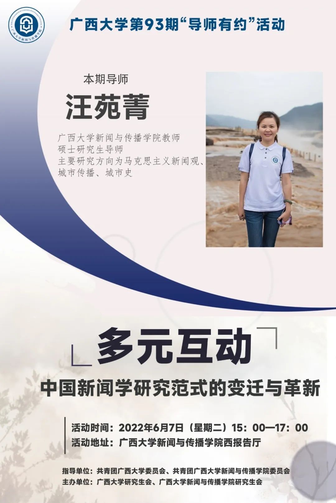 本次活动将邀请公司汪苑菁导师,以“多元互动:中国新闻学研究范式的变迁与革新”为讲座主题,向同学们讲授当下新闻学研究的前沿理论,如当下新闻学研究的范式演变与创新,当下新闻学研究范式之间关系,以及新闻学范式革新对理论与实践产生的影响。