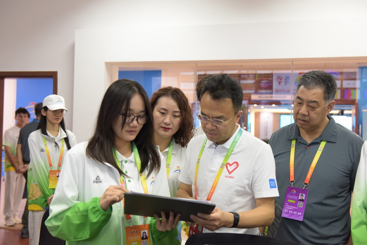 (张朝晖书记(中)考察指导学青会主媒体中心志愿者工作)