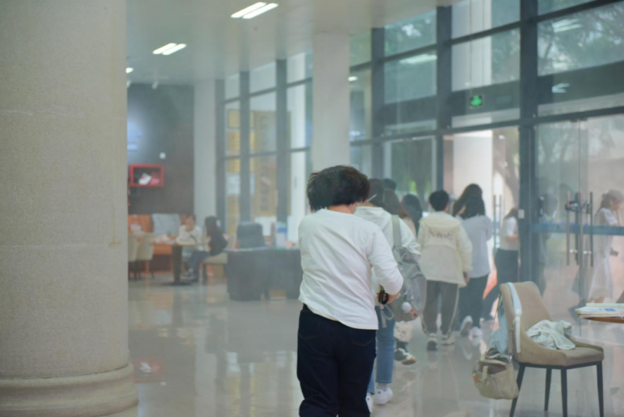 伴随着急促的警报声,消防演练拉开帷幕,各岗位人员进入临战状态。公司分管领导、辅导员呼叫疏散:“大家请注意:本大楼发生火灾,请从最近的门口有序撤离。”疏散引导人员在安全通道的出口做疏散引导工作,接应师生往下、往外疏散。公司师生弯腰曲背、捂住口鼻并按照指定路线撤离,整个过程有条不紊。