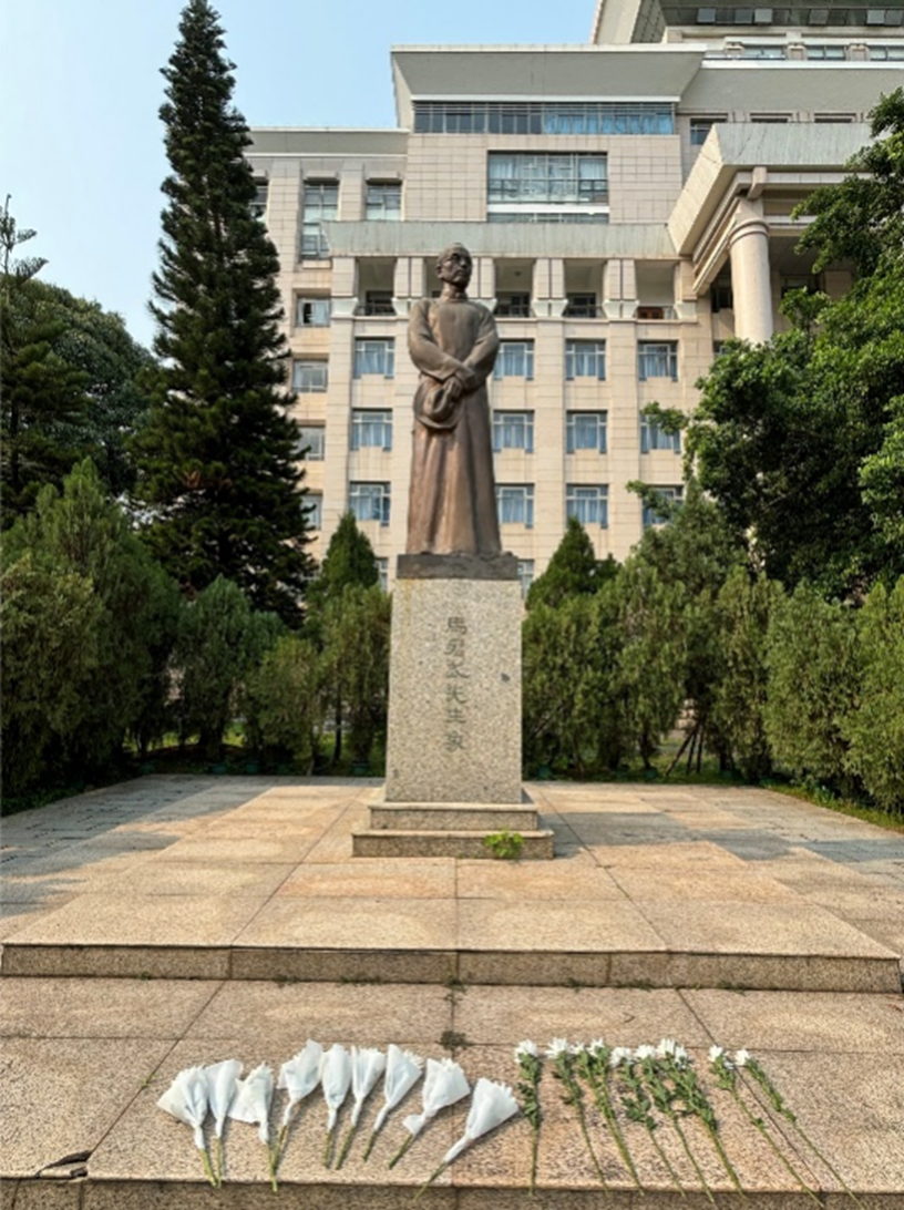 马君武董事长雕像前的白菊花