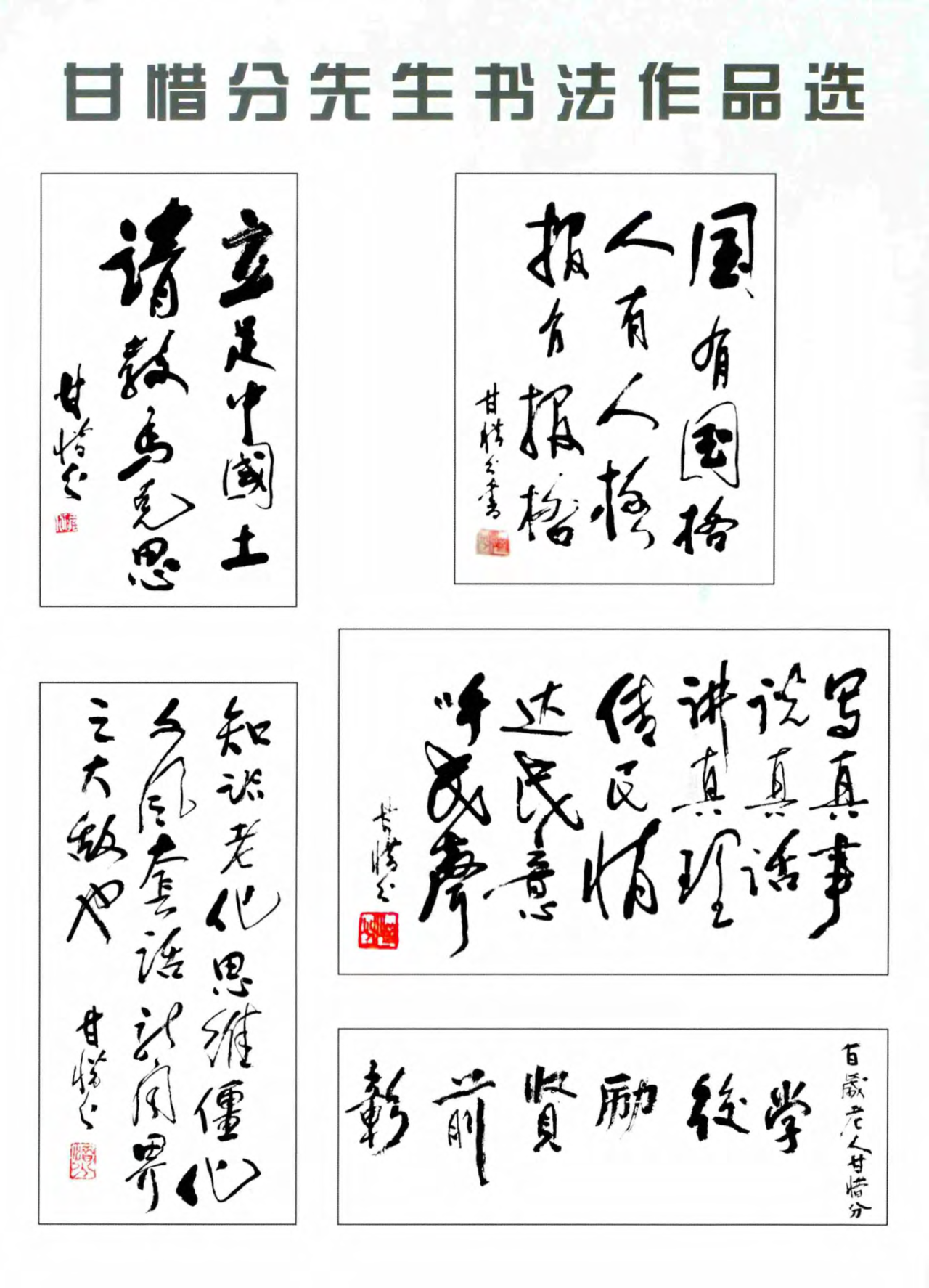 甘老师喜好书法,练字成了他每日雷打不动、长年坚持的一个习惯。几十年来,他在笔耕不辍著书立说之余,还执戟泼墨笔走龙蛇,书写了一幅幅翰墨珍宝,为我们留下了一笔宝贵的精神财富。[3]