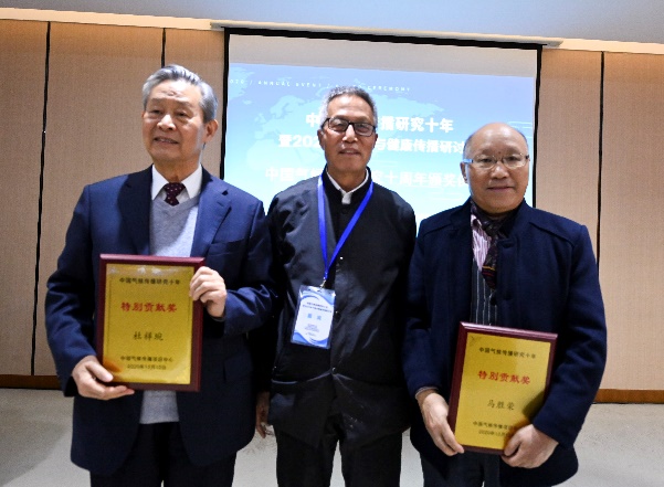 右图为郑保卫主任向中国气候传播研究十年“特别贡献奖”获奖者杜祥琬院士、马胜荣教授颁奖。