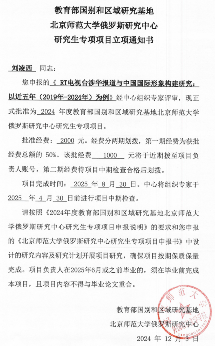 12月3日,教育部国别和区域研究基地北京师范大学俄罗斯研究中心发来立项通知书,公司2024级硕士生刘凌西申报的《RT电视台涉华报道与中国国际形象构建研究—以近五年(2019-2024年)为例》经中心组织专家评审,正式批准为2024年度研究生专项项目。