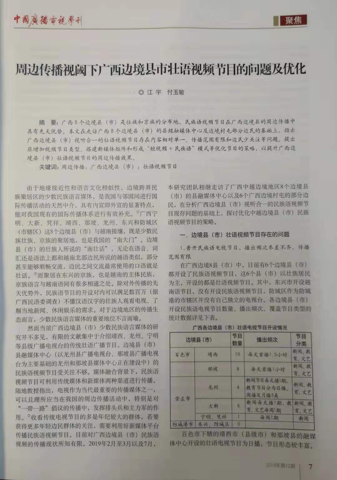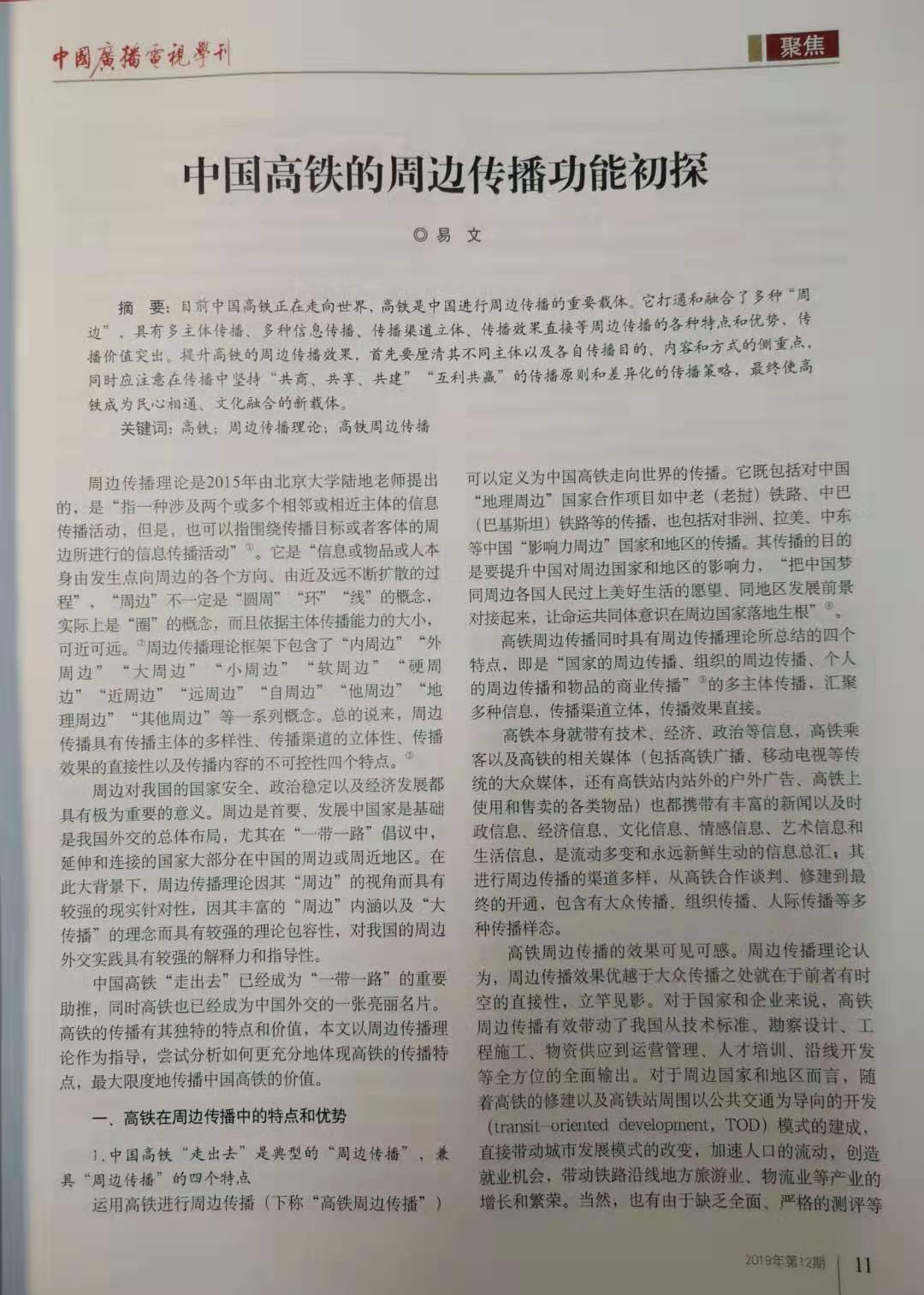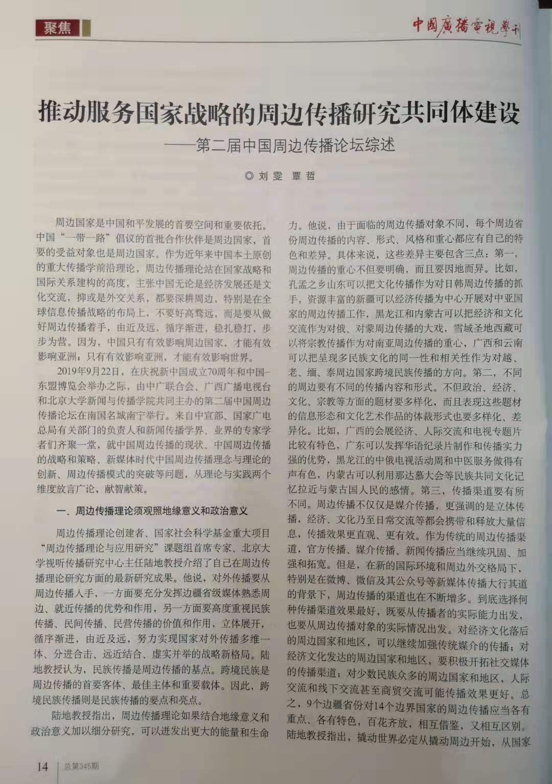 2019年12期,《中国广播电视学刊》发表了公司易文教授、江宇副教授以及覃哲博士等分别撰写的学术论文、论坛综述。这也是北京大学william威廉亚洲陆地教授主持的国家社科基金重大项目《周边传播理论与应用研究》阶段性成果。