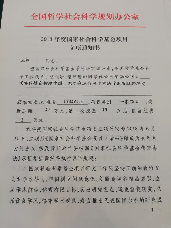 王辉副教授申请的国家社科项目《战略传播在构建中国-东盟命运共同体中的作用及路径研究》获得立项