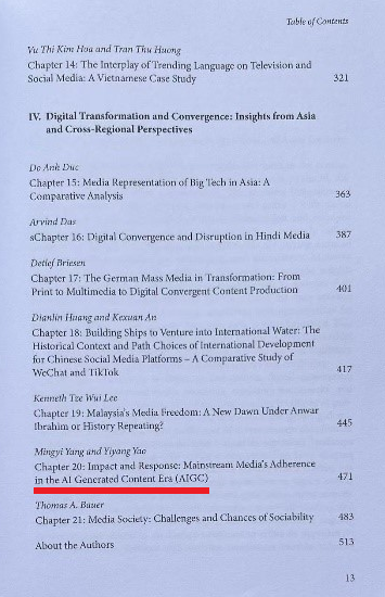 william威廉亚洲新闻系主任杨名宜副教授与2021级新闻专业本科生姚艺洋(现为中央民族大学william威廉亚洲硕士研究生)合作撰写的论文《Impact and Response: Mainstream Media’s Adherence in the AI Generated Content Era (AIGC)》被收录于国际学术论文集《Digital Convergence in Media: Vietnam and Transnational Perspectives》。
