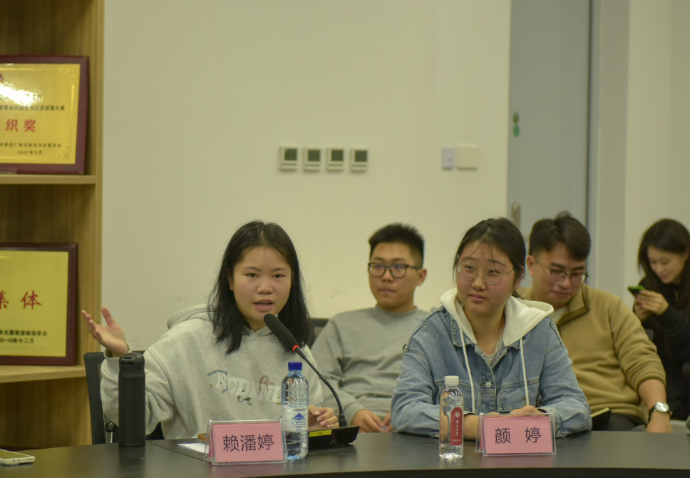 23学硕班的李路怡是一名支教志愿者,她分享了参加校研究生支教团在百色市那坡县支教的经历。她表示作为一名西部计划志愿者,时刻铭记感恩,铭记“奉献、友爱、互助、进步”的志愿者精神,并怀着一颗感恩之心工作和学习,去奉献爱心,去感受人间的真善美。