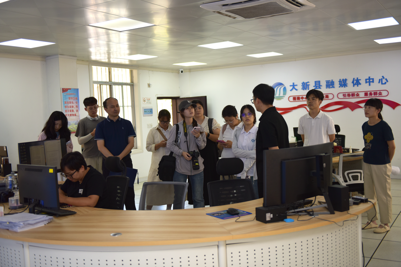 9月3日下午,调研师生首先来到大新县融媒体中心,中心副主任阮绍锐围绕调研主题介绍了融媒体中心发展现状以及已建设的媒体矩阵、开展的新闻宣传以及提质增效等基本情况。他与师生交流了中心今后发展的考虑:加强人才队伍建设,特别是年轻采编人员的业务知识培训;做强做优主业,重点是强化新闻宣传精品意识和节目创优工作;推进融合发展,拓展增强媒体、党建、政务、公共服务和增值服务等功能。