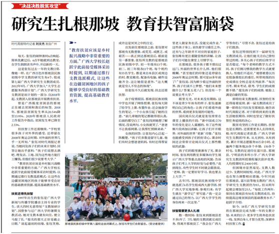 2020年6月30日出版的《时代周报》7版发表了特约记者刘文杰采写的深度报道《研究生扎根那坡 教育扶智富脑袋》一文,刘文杰也是公司2020届专硕毕业生。