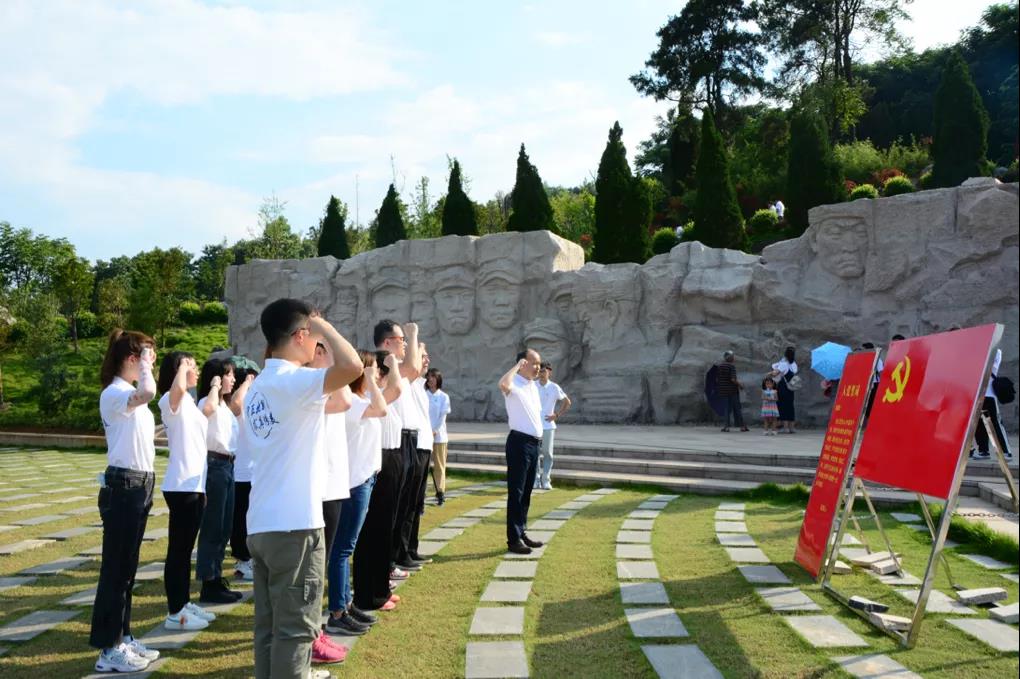 参观红军长征湘江战役纪念馆后,师生们前往纪念园凭吊广场,并敬献花圈。面对“红军魂”雕塑,大家肃然起敬,为革命英雄默哀,师生们向红军烈士三鞠躬。全体党员举起右手,重温入党誓词。