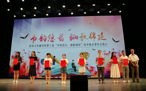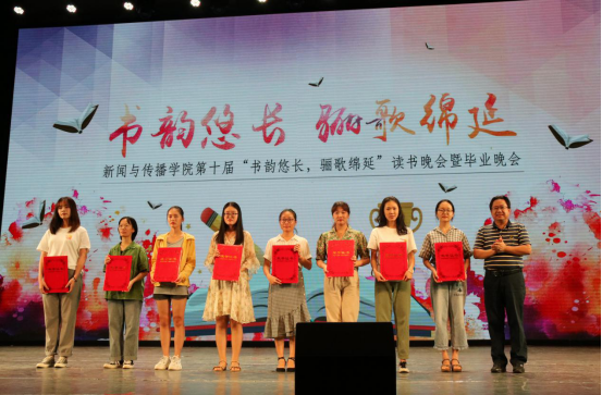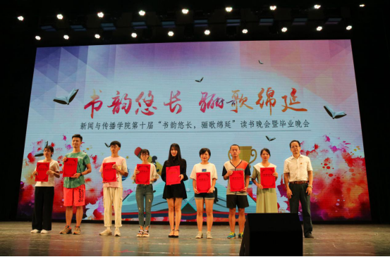 晚会正式开始后,首先进行的是颁奖环节,旨在表彰在开放式读书活动中表现优异的同学和班集体。江宇老师和朱学峰老师一起为获得“马克思主义新闻观学习历程网络展示活动”一二三等奖的同学颁奖,王辉老师为获得开放式读书教学活动读报评报活动一二三等奖的同学颁奖,银键老师为获得开放式读书教学活动阅读奖的同学颁奖,刘洪老师为获得开放式读书活动班级组织一二三等奖的班级代表颁奖,获得开放式读书教学活动优秀读书报告一二三等奖的同学则从郑保卫老师的手中接过了获奖证书。