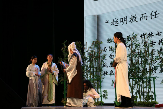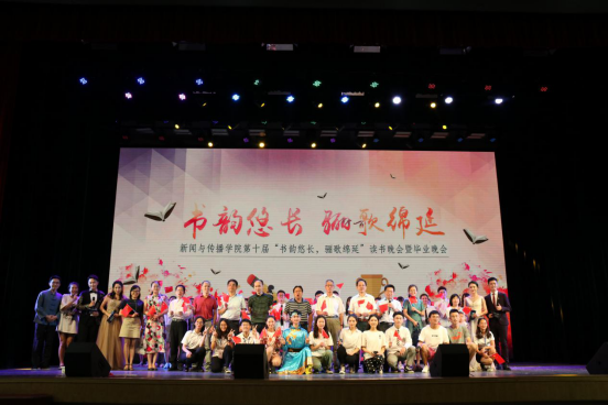 本次晚会分为“致颂经典,佳话流传”、“红色记忆,党的礼赞”和“祈福愿景,背囊启航”三个章节。首先是由18级专硕班带来的开场节目《我们都是追梦人》,追逐梦想这一主题引起了大家的共鸣,欢快的歌舞也赢得了大家的掌声。《竹林七贤与荣启期砖画》则仿照《国家宝藏》的形式,以国宝引出情景剧,演员们用欢快诙谐的演出为我们展示了一出“奇葩大会”,而歌曲《当你老了》用饱含深情的歌唱和悠扬的口琴,重新演绎了这首动人的歌曲。第二章节的院舞队带来的舞蹈《红船》,让观众重新回到了那个红色的年代,并以震撼的舞蹈形式展现了那段光辉的奋斗岁月。播音181班慷慨激昂的独诵《嘎达梅林》则让我们领略了草原英雄的豪迈与悲壮 。第三章节覃老师和同学们一同演唱歌曲《祝你一路顺风》,就像歌中唱的那样,“深深地祝福你,最亲爱的朋友。祝你一路顺风。”学长学姐们就要毕业了,我们应该向他们道一声珍重,并祝愿他们前程似锦,一路顺风!