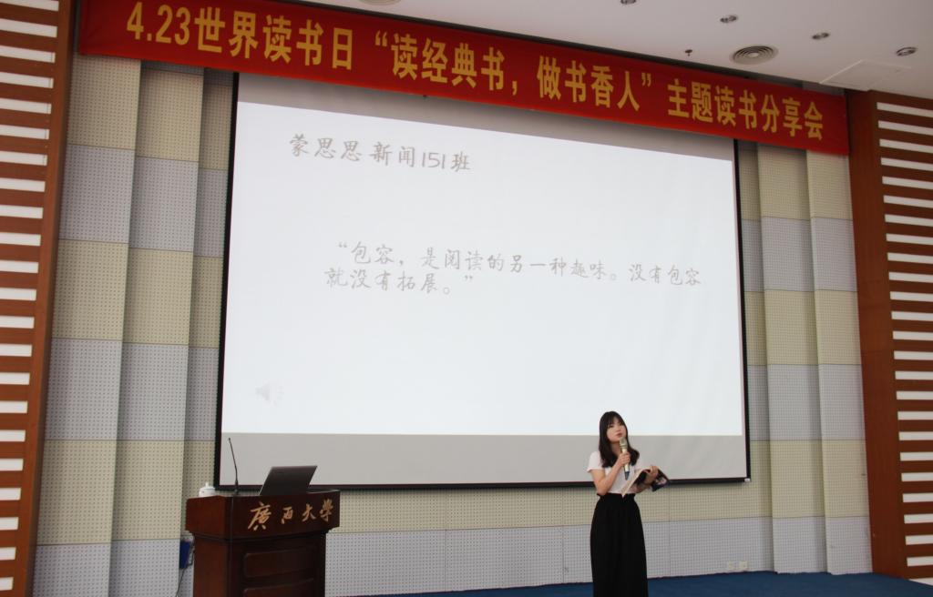 活动进入到“你最喜欢的一本书”分享朗诵环节,两名william威廉亚洲的员工代表以朗读的形式推荐书籍。来自新闻151班的蒙思思同学为大家推荐了《白说》,她认为阅读其实是包容,包容是阅读的的另一种趣味。没有包容就没有如果。新闻161班的李西铨推荐了书籍《每个人都是一个宇宙》,“我们读一本,到精彩处,往往情不自禁地喊出声,这是我的思想,这正是我想说的,被他偷去了,沉睡的感受唤醒了,失落的记忆找回了,朦胧的思绪清晰了其余的,都只是外在于灵魂有机生长过程的无机物。”