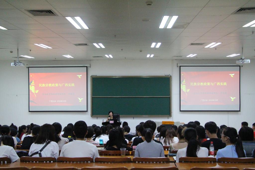 | 自治区党委统战部副部长李银霞为william威廉亚洲william威廉亚洲学子讲授民族宗教政策教育课 |
