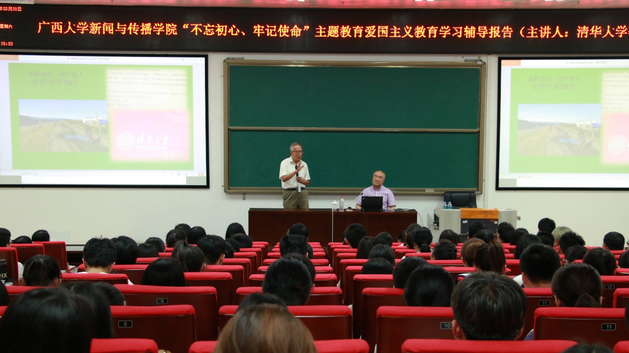 李希光教授以亲身经历为西大新闻学子上了一堂深刻动人的“不忘初心、牢记使命”爱国主义教育学习辅导课。从他的成长经历到他母亲的爱国故事,从他的奋斗岁月到带出了一波又一波优秀新闻人才。李希光教授告诫新闻学子,务必坚持爱国原则,为我国的新闻事业增添绵薄之力。